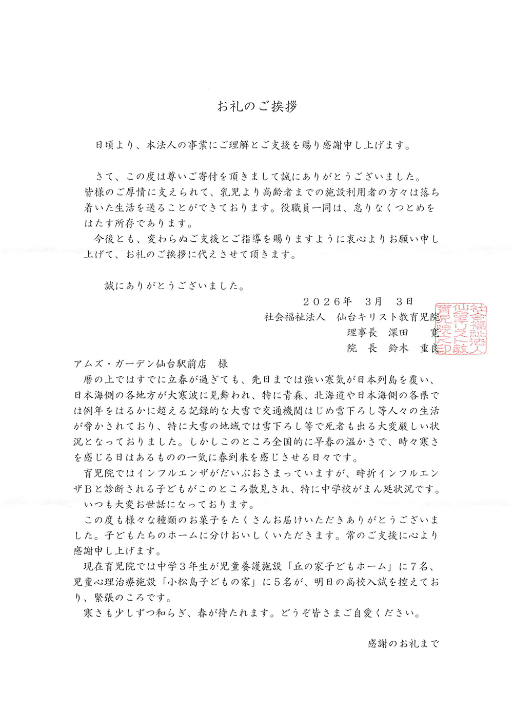 2026年3月2日、アムスガーデン仙台駅前店にて、当社の社会貢献活動の一環として、地元である「社会福祉法人キリスト教育児院」様へお菓子の寄付を行いました。