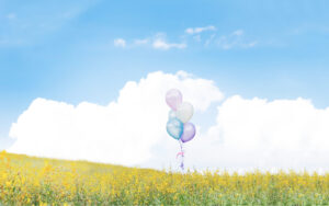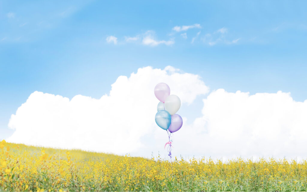 Colorful balloon over yellow flower fields with blue sky background, vintage effect. Relaxation background idea concept.