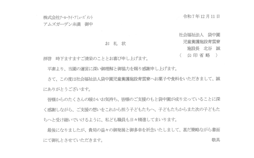 2025年12月11日、私たちアムズらいと糸満店は、地域社会への貢献活動の一環として、社会福祉法人 袋中園(たいちゅうえん)様への寄付活動を実施いたしました。